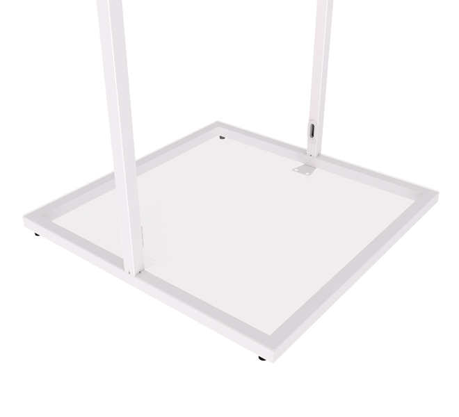 Kabelführung. Optional kann die Bodenplatte abgedeckt oder der Stand direkt am Boden verschraubt werden.