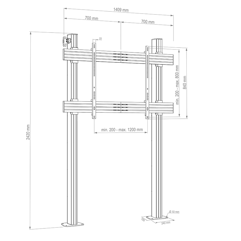 Die stabil ausgeführte Bodenbasis mit einer Standfläche von 1200 x 700 mm trägt das Display
