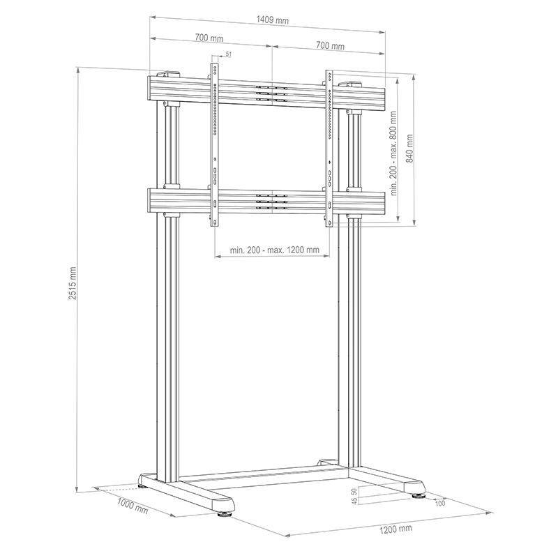 Die Bodenbasis besitzt eine stabile Auflagefläche von 1200 x 700 mm.