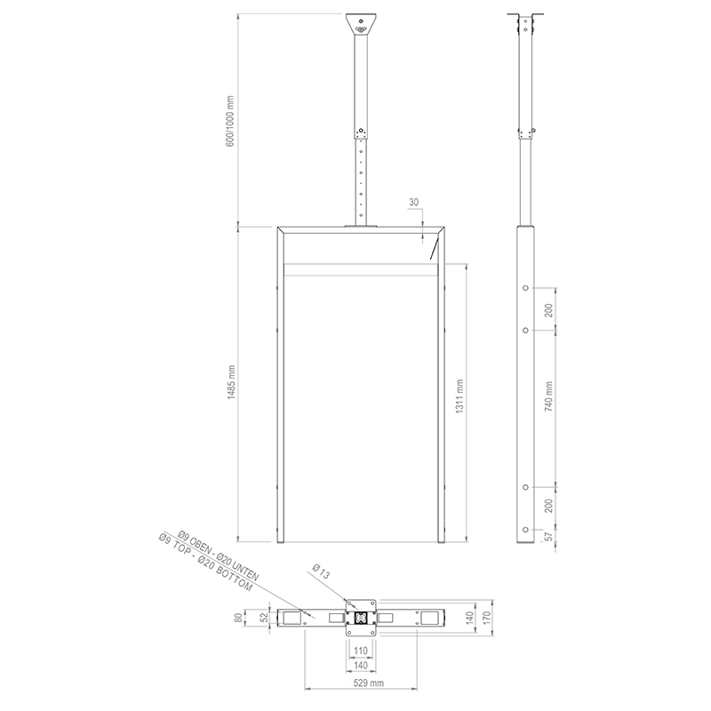 Der Tragarm ist in Raststufen zwischen ca. 600 und 1000 mm höhenverstellbar,