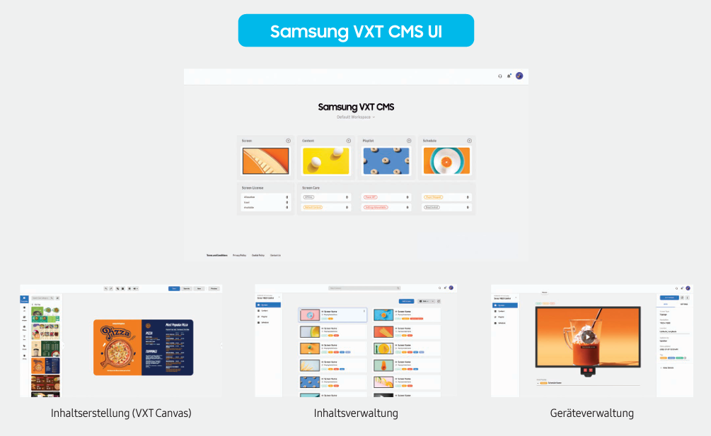 Samsung VXT vereint Inhaltserstellung, Inhaltsveröffentlichung und Gerätemanagement in einer modernen Cloud-Umgebung. Dank der ISO/IEC 27001:2022- und ISO/IEC 27701:2019-Zertifizierungen erfüllt VXT höchste Anforderungen an Sicherheit und Datenschutz. Ob Einzelstandort oder große Flotte, ob Office-, Schaufenster- oder Outdoor-Displays: VXT skaliert flexibel, ist mobil bedienbar und jederzeit zuverlässig.