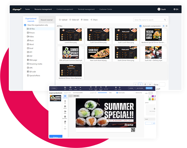 Mit iiSignage², dem Content-Management-System von iiyama, verwalten Sie kompatible iiyama-Displays zentral in der Cloud: Inhalte hochladen, Zeitpläne erstellen, veröffentlichen und die Screens aus der Ferne überwachen – alles im Browser und einfach in der Handhabung. Die perfekte Lösung für Einzelhandel, Gastronomie, Bildung und Corporate-Kommunikation.