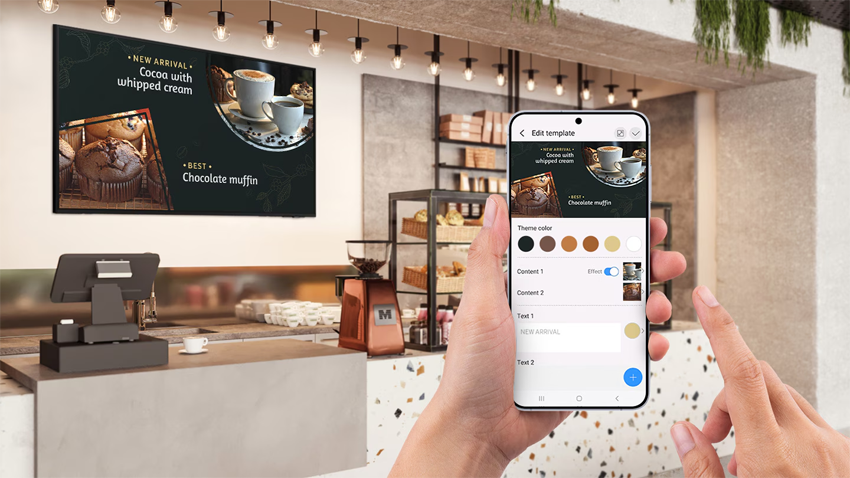 Über die Samsung Business TV App (Android/iOS) lassen sich Inhalte hochladen, Layouts nutzen, Playlisten und Timer erstellen und Bildschirme ein-/ausschalten – ohne zusätzliche Hardware oder Lizenzkosten.