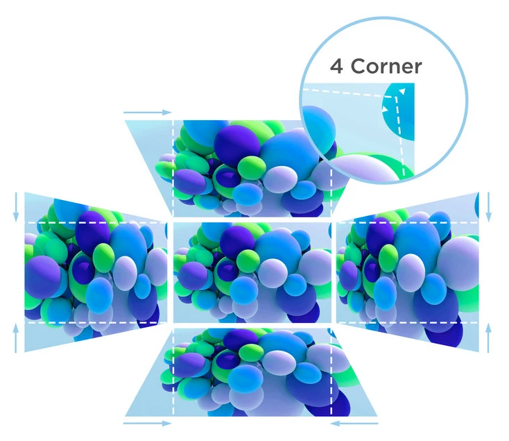 Der Projektor unterstützt H/V-Keystone-Korrektur mit ±15° und eine 4-Ecken-Anpassung, um das Bild an die
